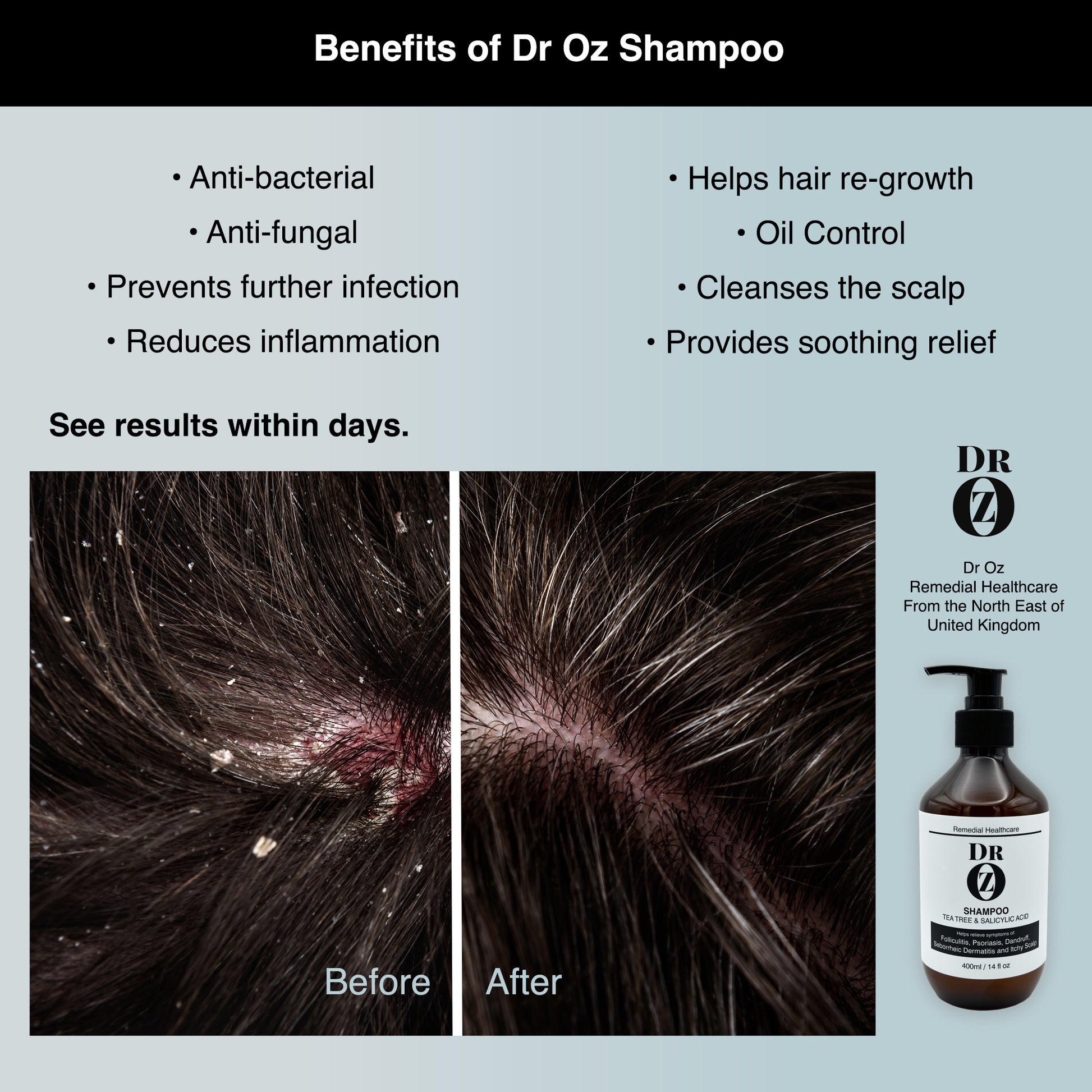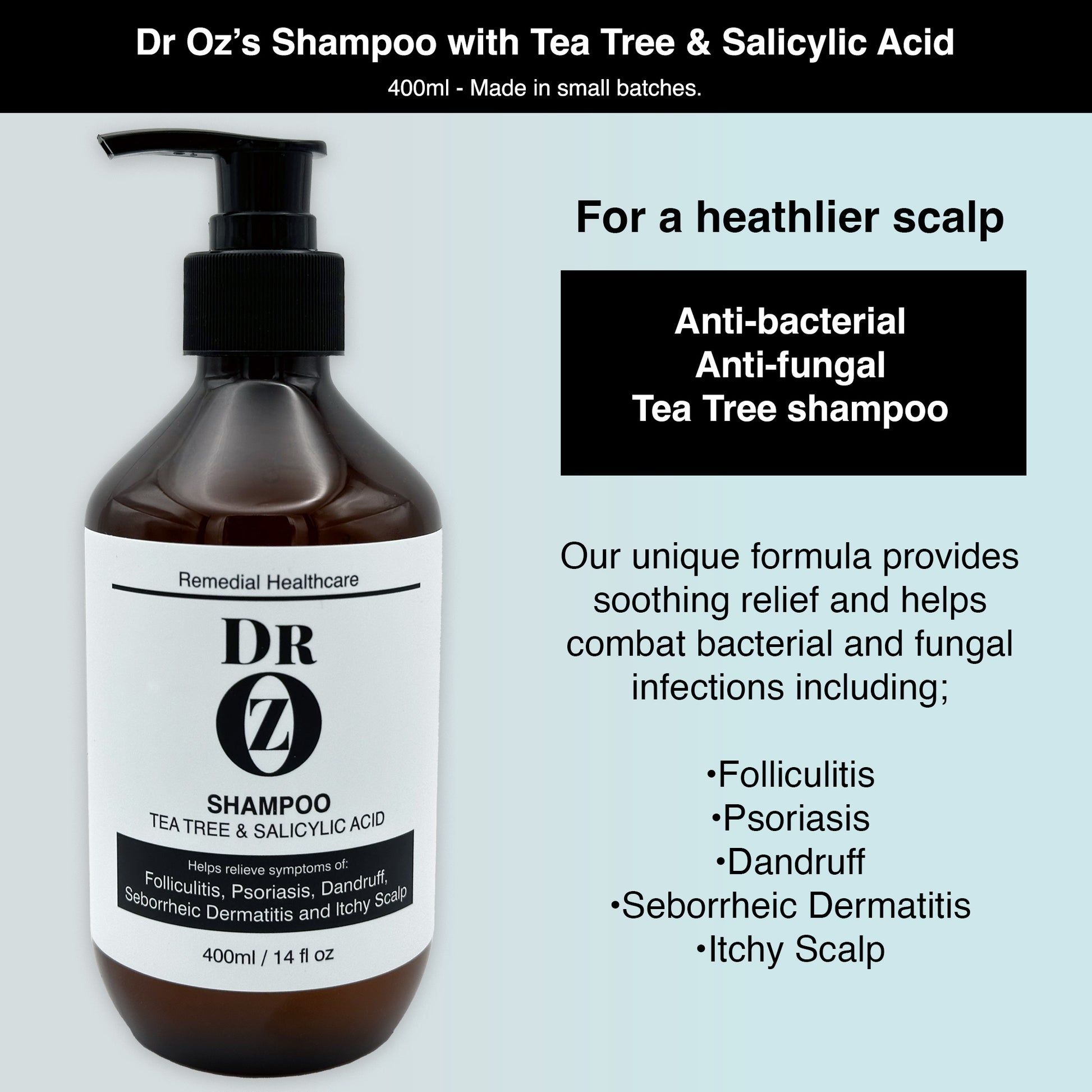 Experience the soothing relief of DR Oz shampoo enriched with Tea Tree and Salicylic Acid. This effective formula is tailored to address a wide range of conditions such as folliculitis, psoriasis, dandruff, seborrheic dermatitis and itchy scalp. Our blend of ingredients is designed to target the root cause of these scalp issues as well as sooth irritation, reduce inflammation and promote healing, leaving your scalp feeling rejuvenated.
